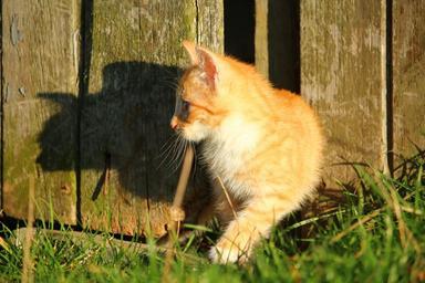 Keywords: cat kitten red mackerel tabby cat baby young cat red cat grass wooden wall