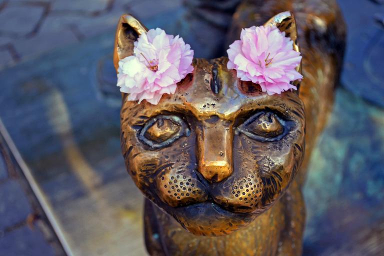 Keywords: cat monument uzhgorod ukraine flowers bronze