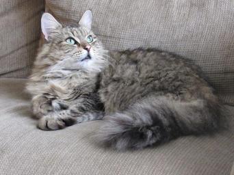 Keywords: cat portrait domestic cute pet feline kitty close resting reclining looking whiskers paws furry long hair indoors