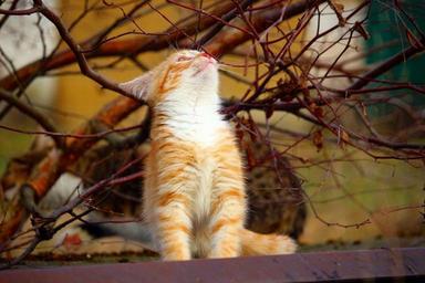 Keywords: cat red mackerel tabby kitten cat baby aesthetic birch tree autumn playful