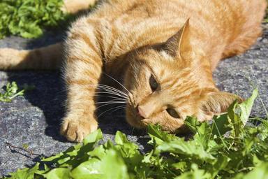 Keywords: cat red pet fur cute domestic ginger striped relax laying grass look