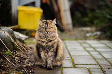 Keywords: cat sitting portrait pet domestic feline cute eyes head close up looking resting kitty furry patio stones outdoors tabby longhair