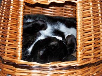 Keywords: cat sleeping hide wicker basket domestic short haired black white face whiskers close-up catnap