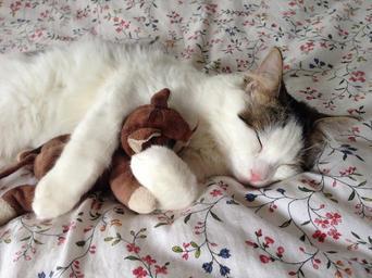 Keywords: cat sleeping stuffed toy hug relax pet