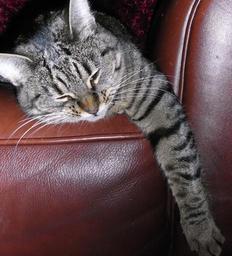 | Keywords: cat stripes lazy sleeping chair pet domestic cute feline fur mammal lying relax kitty resting paw whisker rest whiskers striped gray white relaxation nap tabby head face tired laziness comfortable pedigree friend companion leather chair red |