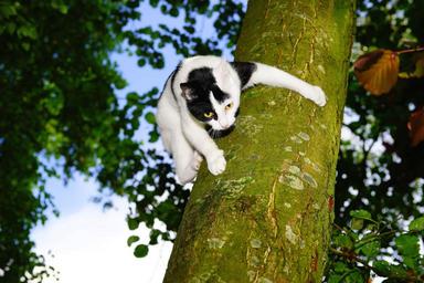 Keywords: cat tree climb young cat pet nature cat in the tree domestic cat in the free curious playful animal animal world black and white fur adidas