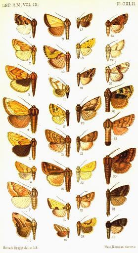 | Keywords: CATALOGUE-BM-PLATE CXLII.jpg en PLATE CXLII 1 Calymnia olivescens cm Vol IX p 200 Br E Africa 2 Cirrhophanus dyari m p 203 Arizona H9765 Ckll 1899 3 C dubifera f · p 204 Mexico 4 C magnifera m p 204 Mexico 5 C nigrifera f p 205 Guatemala 6 C papago m p 206 New Mexico H9768 Barnes 1907 7 Basilodes chrysopis m p 208 New Mexico H9780 Grt 1881 8 B mirabilis m p 208 Arizona H9735 Heminocloa mirabilis Neum 1884 9 Ectolopha marginata f p 213 Br E Africa 10 Chalcopasta houardi f p 219 Arizona H9776 C howardi Hy Edw 1877 11 C coebelei m p 222 Kansas H9779 C koebelei Riley 1893 12 Psectrotarsia flava f p 233 Peru 13 Enargia staudingeri m p 237 E Turkestan 14 E decolora m p 239 Canada H9549 E decolor Wlk 1858 15 Stiria sulphurea m p 243 Arizona H9787 Neum 1882 16 S hutsoni m p 244 Arizona H9756 Polenta hutsoni Sm 1907 17 S fulginosa m p 244 California H9756 Polenta hutsoni Sm 1907 18 Stiriodes perflava m p 247 Texas H9727 Harv 1907 19 Plagiomimicus triplagiata m p 251 Colorado H9753 P triplagiatus Sm 1890 20 P dolli m p 252 Arizona H9740 Stibadium ochoa Barnes 1904 21 P expallida m p 252 Colorado H9753 P expallidus Grt 1883 22 Nocloa aliaga f p 254 New Mexico H9800 Barnes 1905 23 N cordova m p 254 Arizona H9796 Barnes 1907 24 N nanata f p 255 New Mexico H9797 Neum 1884 25 N plagiata m p 255 Arizona H9793 Sm 1906 26 N nesaea f p 256 Arizona H9795 N pallens Tepper 1882 27 N arivaca f p 257 New Mexico H9770 Hoplolytha arivaca Barnes 1907 28 Oslaria viridescens m p 257 Mexico 29 Bellura melanopyga f p 262 Florida H9523 B gortynoides Wlk 1865 30 B diffusa m p 262 Canada H9523 B gortynoides Wlk 1865 31 Phragmatiphila serrata m p 268 Uganda 32 P fumea m p 269 Sikhim CATALOGUE OF THE NOCTUIDAE IN THE COLLECTION OF THE BRITISH MUSEUM Sir GEORGE F HAMPSON Bart 1903-1913 PD-old Catalogue of Lepidoptera Phalaenae in the British Museum Vol 4 |