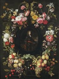 | Keywords: Catarina Ykens - garland painting with cavalry officer.jpg en Portrait of an officer three-quarter-length in armour holding a commander's baton a coastal cavalry battle in the background in a stone cartouche surrounded by garlands of tulips roses carnations purslane and other flowers plums grapes chestnuts hazelnuts and other fruits and nuts with a butterfly and dragonfly oil on canvas 104 4 x 78 8 cm 1635 1666 http //www christies com/lotfinder/paintings/attributed-to-catharina-ykens-portrait-of-an-5622907-details aspx Christies Catarina Ykens I PD-old-100 Catarina Ykens I Garland of flowers frame in paintings |