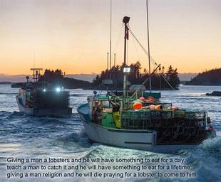 | Keywords: catching lobster catchinglobster quotation giving feeloaders fishermem boat sunset text words nova scotia novascotia religion vehicle outdoor waterfront sea water Giving a man a lobsters and he will have something to eat for a day; teach a man to catch it and he will have something to eat for a lifetime; giving a man religion and he will die praying for a lobster to come to him. Giving a man a lobsters and he will have something to eat for a day; teach a man to catch it and he will have something to eat for a lifetime; giving a man religion and he will die praying for a lobster to come to him. |
