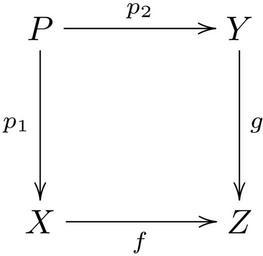 | Keywords: Categorical pullback.svg en The commutative square for a categorical pullback of two maps Own Ryan Reich 2009-01-14 File CategoricalPullback-03 png LaTeX source <pre> \documentclass amsart \usepackage amsmath amssymb nopageno \usepackageall xy \begin document \begin equation \xymatrix C+2em R+2em P \ard_ p_1 \arr p_2 Y \ard g \\ X \arr_ f Z \end equation \end document </pre> Commutative squares Images with LaTeX source code | ||||