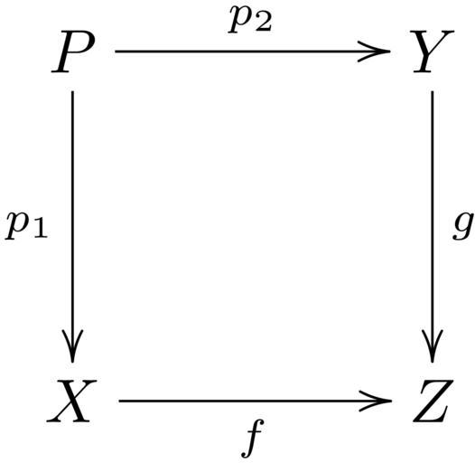 Keywords: Categorical pullback.svg en The commutative square for a categorical pullback of two maps Own Ryan Reich 2009-01-14 File CategoricalPullback-03 png LaTeX source <pre> \documentclass amsart \usepackage amsmath amssymb nopageno \usepackageall xy \begin document \begin equation \xymatrix C+2em R+2em P \ard_ p_1 \arr p_2 Y \ard g \\ X \arr_ f Z \end equation \end document </pre> Commutative squares Images with LaTeX source code |