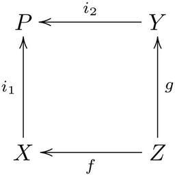 | Keywords: Categorical pushout.svg en A commutative diagram depicting the categorical pushout of two maps Own Ryan Reich 2009-01-14 File CategoricalPushout-01 png LaTeX source <pre> \documentclass amsart \usepackage amsmath amssymb nopageno \usepackageall xy \begin document \begin equation \xymatrix C+2em R+2em P \ar <- d_ i_1 \ar <- r i_2 Y \ar <- d g \\ X \ar <- r_ f Z \end equation \end document </pre> Commutative squares Images with LaTeX source code | ||||