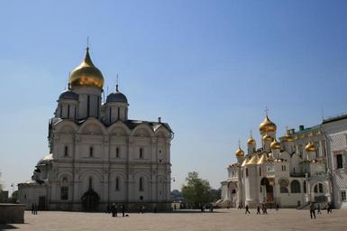 Keywords: cathedral of the archangel architecture white building domes 1 golden dome 4 metalic blue domes church russian orthodox religion annunciation church
