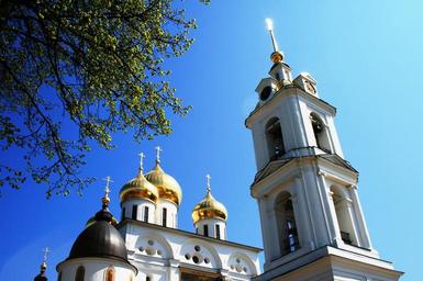 Keywords: cathedral church white architecture high steeple building bell tower golden domes black dome tree religion orthodox sky