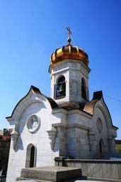 Keywords: cathedral russian orthodox religion architecture golden dome arches white walls bellfry window slats russian orthodox cross blue sky day time