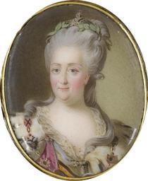 | Keywords: Catherine II after Lampi (18th c., priv.coll).jpg Russian School 18TH CENTURY PORTRAIT OF CATHERINE II 'THE GREAT' EMPRESS OF RUSSIA 1729-1796 with small diamond crown and laurel wreath on her powdered and curled hair wearing an ermine cape with the chain of the Order of St Andrew and the sash of the Order of St George enamel held in a silver and gold openwork frame of leaves and flowers set with emeralds rubies and diamonds 3 by 2 5 cm ; 1 1/2 by 1 in READ CONDITION REPORT PROVENANCE Anonymous sale Bonhams London The Connoisseur's Cabinet 7 November 2001 lot 250 CATALOGUE NOTE Enamel images of Catherine were often presented by her as gifts to supporters of the throne or foreign dignitaries The present lot which is elaborately framed may have been one such gift The composition for the present enamel is derived from Fyodor Stepanovich Rokotov's 1780 full-length painting Hermitage St Petersburg http //www sothebys com/en/auctions/ecatalogue/2010/an-exceptional-eye-a-private-british-collection-l10041/lot 28 html century 18 18 Catherine II in portrait miniatures Catherine II by Lampi Files uploaded by Shakko from various sources Images from Sotheby's Catherine II by Rokotov PD-old |