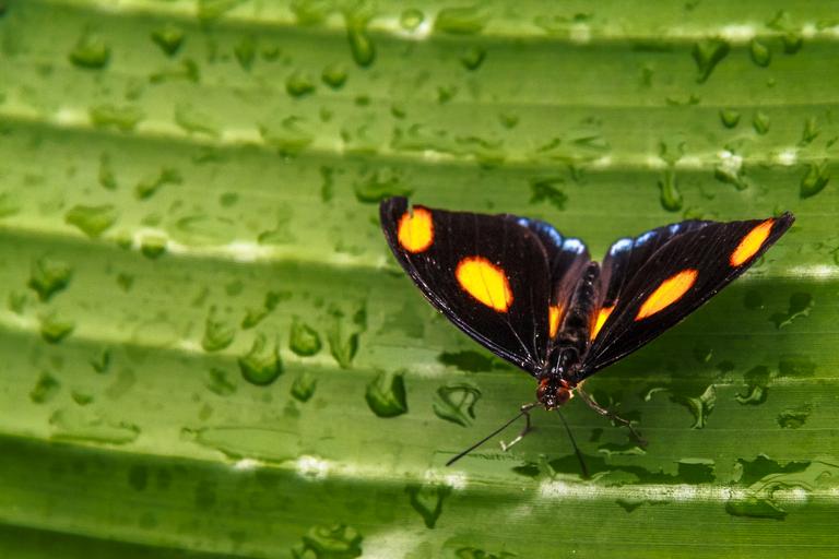 Keywords: outdoor animal insect butterfly The Blue-frosted Banner, Blue-frosted Catone, Grecian Shoemaker, or Stoplight Catone (Catonephele numilia) is a butterfly of the Nymphalidae family found in Central and South America. There is sexual dimorphism in the adults, with the males being black with six orange dots on the dorsal surface of the wings, whereas females are black with a light yellow band across the centre of the fore wings. This butterfly usually flies along the ground and close to the ripe fruits and flowers. It can live a month. Adults feed on rotten fruits, while caterpillars feed on Alchornea species (family Euphorbiaceae). en.wikipedia.org/wiki/Catonephele_numilia otagomuseum.nz/whats-on/do/dwtf/experience/tropical-forest The Blue-frosted Banner, Blue-frosted Catone, Grecian Shoemaker, or Stoplight Catone (Catonephele numilia) is a butterfly of the Nymphalidae family found in Central and South America. There is sexual dimorphism in the adults, with the males being black with six orange dots on the dorsal surface of the wings, whereas females are black with a light yellow band across the centre of the fore wings. This butterfly usually flies along the ground and close to the ripe fruits and flowers. It can live a month. Adults feed on rotten fruits, while caterpillars feed on Alchornea species (family Euphorbiaceae). en.wikipedia.org/wiki/Catonephele_numilia otagomuseum.nz/whats-on/do/dwtf/experience/tropical-forest |