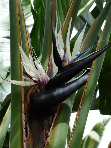 Keywords: caudata blossom bloom white black blue tree caudata strelitzia nicolai strelitzia caudata greenhouse strelitziaceae white flower of bird of paradise white caudata