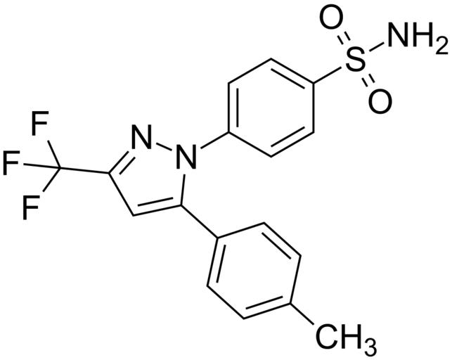 | Keywords: Celecoxib 200.svg  validSVG Structure of 4- 5- p-tolyl -3- trifluoromethyl -1H-pyrazol-1-yl benzenesulfonamide Own 2014-04-29 Emeldir <span class signature-talk >talk</span> Chemical structure verified https //upload wikimedia org/wikipedia/commons/6/63/Celecoxib_200 svg 1S/C17H14F3N3O2S/c1-11-2-4-12 5-3-11 15-10-16 17 18 19 20 22-23 15 13-6-8-14 9-7-13 26 21 24 25/h2-10H 1H3 H2 21 24 25 RZEKVGVHFLEQIL-UHFFFAOYSA-N 169590-42-5 Synonyms <small>4- 5- p-Tolyl -3- trifluoromethyl -1H-pyrazol-1-yl benzenesulfonamide 4- 5-p-Tolyl-3-trifluoromethyl-pyrazol-1-yl -benzenesulfonamide 4-5- 4-Methylphenyl -3-trifluorpmethyl -1H-pyrazol-ylbenenesulfonamide 4-5- 4-Methylphenyl -3-trifluorpmethyl -1H-pyrazol-ylbenzenesulfonamide 4-5- 4-Methylphenyl -3- trifluoromethyl -1H-pyrazol-1-yl benzenesulfonamide 4-5- 4-Methylphenyl -3- trifluoromethyl -1H-pyrazol-1-ylbenzenesulfonamide 4-5- 4-methylphenyl -3- trifluoromethyl -1H-pyrazol-1-ylbenzenesulfonamide 4-5- 4-methylphenyl -3- trifluoromethyl pyrazol-1-ylbenzenesulfonamide 4-5- 4-Methylphenyl -3-trifluoromethyl -1H-pyrazol-ylbenzenesulfonamide p-5-p-Tolyl-3- trifluoromethyl pyrazol-1-ylbenzenesulfonamide AI-525 Celebra Celebrex Celecox Celecoxib Celecoxib Celebrex Celecoxibum Celekoxib CJ-016377 CP-598107 HSDB 7038 Niflam Onsenal PF-00345549 PHA-00846533 Research programme injectable celecoxib - Acusphere/Cephalon SC 58635 SC-58635 Selekoksib Selekoksibi YM 177 YM-177 YM177 Zycel</small> PD-chem Celecoxib  |