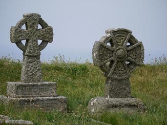 Keywords: celtic cross 19 century tombstone moss roof old overgrown cemetery silent religion stone historically grave england weathered cross stony