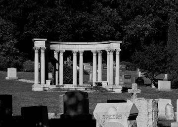 Keywords: cemetery graveyard greek columns pillars black white headstones tombstones landscape structure monument
