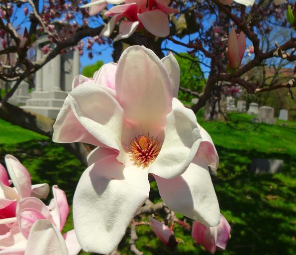 Keywords: cemetery graveyard magnolia tree gravestone tombstone mausoleum dead death outdoors nature landscape stone color flower bloom branch grass