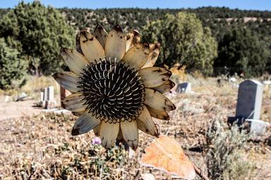 Keywords: cemetery sunflower metal grave graveyard bereavement death funeral grief religion stone tomb flower burial gravestone headstone lonely memorial loss monument pine valley utah desert decoration tombstone dead marker day tree national summer leaves old ancient cedar tree brush bright orange yellow hot southwest wilderness