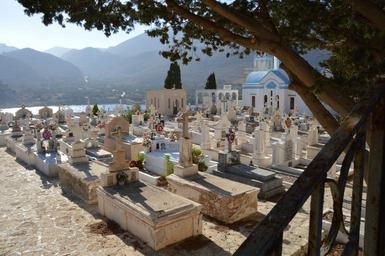 Keywords: cemetery yard chalki greece grave cross sea island
