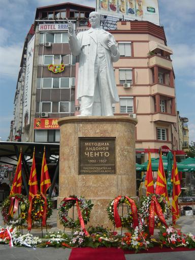 | Keywords: Cento monument on Macedonian National holiday Ilinden - 2 Aug 2010.JPG en Marking of 2 August Ilinden the Macedonian national holiday at Metodija Andonov Cento's monument on Macedonia Square in Skopje own Dvacet 02-08-2010 Čento Monument Skopje National holidays |