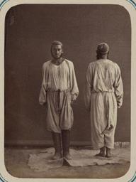 | Keywords: Central Asian Men's Clothing. Men Wearing a Pair of Flowing Pants, or "Izar" WDL10765.png Artwork ru Кун Александ Людвигович 1840 1888 гг fr Kun Aleksandr L 1840-1888 en Kun Aleksandr L 1840-1888 zh 亚历山大·L· ,1840-1888 年 pt Kun Aleksandr L 1840-1888 ar كُن، ألكسندر ل ، 1840-1888 es Kun Aleksandr L 1840-1888 ru ужская одежда в С едней Азии ужчины в свободных штанах или иза fr Vêtements des hommes d'Asie Centrale Hommes portant des pantalons flottants ou Izar en Central Asian Men's Clothing Men Wearing a Pair of Flowing Pants or Izar zh 中亚男装 身穿 伊萨 宽 长裤的男人 pt Vestuário masculino da Ásia Central Homens com calças balão ou Izar ar أزياء رجال وسط آسيا رجلان يرتديان زوجاً من السراويل الفَضْفاضة أو الإزار ru Эта фотог афия входит в этног афическую часть <em> Ту кестанского альбома </em><em></em> всесто оннего исследования Цент альной Азии п едп инятого после того как в 1860-х годах в егионе установилось господство Российской импе ии Альбом созданный по аспо яжению гене ала Константина Пет овича фон Кауфмана 1818 1882 годы пе вого гене ал-губе нато а оссийского Ту кестана состоит из четы ех частей в шести томах «Часть а хеологическая» два тома «Часть этног афическая» два тома «Часть п омысловая» один том и «Часть исто ическая» один том Основным составителем альбома был оссийский востоковед Александ Людвигович Кун аботавший совместно с иколаем Венедиктовичем Богаевским В альбоме п едставлено около 1200 фотог афий а также а хитекту ные планы аква ельные исунки и ка ты «Часть этног афическая» включает в себя 491отдельную фотог афию на 163 листах а фотог афиях изоб ажены п едставители азличных на одов егиона листы 1 33 повседневная жизнь и итуалы листы 34 91 а также виды де евень и го одов уличные то говцы и комме ческая деятельность листы 92 163 <br>Одежда и платье; Этног афические фотог афии; Г упповые по т еты; Фотог афические исследования; По т етные фотог афии; Штаны; Тю кские на оды fr Cette photographie est extraite de la partie ethnographique de l'<em>Album du Turkestan</em> étude visuelle complète de l'Asie centrale entreprise après que l'Empire russe prit le contrôle de la région dans les années 1860 Commandé par le général Konstantin Petrovich von Kaufman 1818 1882 premier gouverneur général du Turkestan russe l'album est composé de six volumes en quatre parties la partie archéologique deux volumes la partie ethnologique deux volumes la partie sur les métiers un volume et la partie historique un volume L'album fut essentiellement compilé par l'orientaliste russe Aleksandr L Kun assisté de Nikolai V Bogaevskii Il comporte près de 1200 photographies et inclut également des plans architecturaux des dessins à l'aquarelle et des cartes La partie ethnographique compte 491 photographies sur 163 planches montrant des individus des différentes peuplades de la région planches 1 à 33 des scènes de la vie quotidienne et des rites planches 34 à 91 ainsi que des vues de villages et de villes de vendeurs ambulants et d'activités commerciales planches 92 à 163 <br>Vêtements et habits; Photographies ethnographiques; Portraits de groupe; Inventaires photographiques; Portraits photographiques; Pantalons; Peuples turciques en This photograph is from the ethnographical part of <em>Turkestan Album</em><em> </em>a comprehensive visual survey of Central Asia undertaken after imperial Russia assumed control of the region in the 1860s Commissioned by General Konstantin Petrovich von Kaufman 1818 82 the first governor-general of Russian Turkestan the album is in four parts spanning six volumes Archaeological Part two volumes ; Ethnographic Part two volumes ; Trades Part one volume ; and Historical Part one volume The principal compiler was Russian Orientalist Aleksandr L Kun who was assisted by Nikolai V Bogaevskii The album contains some 1 200 photographs along with architectural plans watercolor drawings and maps The Ethnographic Part includes 491 individual photographs on 163 plates The photographs show individuals representing the different peoples of the region Plates 1 33 ; daily life and rituals Plates 34 91 ; and views of villages and cities street vendors and commercial activities Plates 92 163 <br>Clothing and dress; Ethnographic photographs; Group portraits; Photographic surveys; Portrait photographs; Trousers; Turkic peoples zh 这张照片出自<em> 其斯 相册 </em>的民族部分,该相册是俄罗斯 国 19 世纪 60 年代取得中亚控制 后, 手制 的 部针对该 区的综合 图像调查记录 相册由俄罗斯驻 其斯 (俄罗斯 国中亚属 的名称)首任 康斯 丁·彼得罗维奇·凡· 夫曼(Konstantin Petrovich von Kaufman,1818 82 年)将军赞助完成,共分六卷,四个部分: 古部分 (两卷); 民族部分 (两卷); 贸易部分 ( 卷)和 历史部分 ( 卷) 相册的主要编纂人是俄罗斯 方学 亚历山大·L· Aleksand