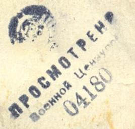 | Keywords: Cenyra USSR WWII.jpg Оттиск печати П осмот ено военной цензу ой в/ч 04180 КО СССР Письмо-т еугольник с ф онта Великой Отечественной войны Transferred from http //ru wikipedia org ru wikipedia<br/> Original text Письмо с ф онта военного пе иода П осмот ено после 13 августа 1943 дата отп авки отскани овано 19 56 22 июня 2010<br/> 2010 06 22 original upload date Авто скана Я Изначально - Военная цензу а СССР Original uploader was AAT at http //ru wikipedia org ru wikipedia PD-RU-EXEMPT PD-RU-exempt Original upload log page ru wikipedia Cenyra_USSR_WWII jpg 2010-06-22 16 23 AAT 265×253× 96182 bytes <nowiki> Изоб ажение Описание Отскани ованный мною отпечаток печати П осмот ено военной цензу ой СССР Источник Письмо с ф онта вое�</nowiki> Post of the Soviet Union Censorship in the Soviet Union |