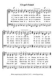 | Keywords: Cequelaino.png Music and lyrics of the w fr Cé qu'è lainô the offical anthem of Geneva Music of the w fr Cé qu'è lainô; lyrics for the four stanzas usually sung are also included Typeset by User Schutz using w en Lilypond Original version around 1603; typeset in January 2007 Author The original lyrics and music are in the public domain due to their age musical notation LilyPond source <pre> Cé qu'è l'ainô \header title Cé qu'è l'ainô \paper line-width 15\cm paper-width 17\cm paper-height 25\cm top-margin 0\cm bottom-margin 0 5\cm left-margin 1\cm right-margin 1\cm \relative \time 3/4 \new ChoirStaff << \new Staff << \key g \major \new Voice main \voiceOne \dynamicUp \key g \major d'--\f d-- d-- d4 -- c8 b4 d c b\> a g\ r d'--\f d-- d-- d4 -- c8 b4 d c b\> a g\ r \repeat volta 2 g g a fis4 e8 d4 g4 fis g a2 d4-- d-- d-- b4 a8 g4 c b a g2 \new Voice second \voiceTwo \key g \major d4 d fis g fis g d d d d8 c b4 r d d fis g fis g d d d d8 c b4 r d e e d cis d d d d d2 d4 g fis g f g g g fis d2 >> \new Lyrics \lyricsto main \set stanza 1 Cé qu'è lai -- nô le Maî -- tre dé ba -- tail -- le Que se mo -- qué et se ri dé ca -- nail -- le A bin fai vi pé on De -- san -- de nai Qu'il é -- ti -- vé Pa -- tron dé Ge -- ne -- voi \new Lyrics \lyricsto main \set stanza 2 I son ve -- gnu le do -- ze de Des -- san -- bro Pè on -- na -- nai as -- se nai -- re que d'an -- cro; Y é -- ti -- vé l'an mil si san et dou Qu'i ve -- ni -- ron par -- la on pour troi tou \new Lyrics \lyricsto main \set stanza 4 Pe -- tis et grans o -- ssis an se -- ve -- gnan -- ce Pè on ma -- tin d'on -- na bel -- la de -- man -- ze Et pè on zeur qu'y fas -- si -- ve bin frai Sans le bon Di nos é -- ti -- von to prai \new Lyrics \lyricsto main \set stanza 68 De -- dian sa man il y tin la vic -- toi -- re A lui so -- let en dé -- mu -- re la gloi -- re; A to za -- mai son Sain Non sai be -- gni A -- men A -- men ain -- si ain -- si soit -- y \new Staff << \clef bass \key g \major \new Voice b 4 \f g a b a g b f g f g r b g a b a g b f g f g r b b a a g a g a b f2 b4 d d d c b e d c b2 >> >> \version 2 8 7 </pre> PD-old L'Escalade Franco-Provençal language Images with LilyPond source code |