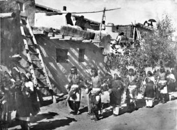 | Keywords: Ceremony of the fiesta de San Esteban, Acoma Pueblo, 1886 (CHS-4504).jpg en <br> Ceremony of the fiesta de San Esteban Acoma Pueblo 1886 Photograph of a ceremony of the fiesta de San Esteban Acoma Pueblo 1886 A procession of about a dozen Acoma Indians can be seen dancing in front of the kisi They are wearing traditional garments including elaborate headpieces They carry goards in their hands as they walk in a procession The kisi is located in the cluster of trees and bushes at right The building behind the dancers is made of adobe and wood The rafter tails are exposed A ladder leans against the building which is pierced with two windows Several onlookers observe from the roof of the building The processing is walking to the left Call number CHS-4504 Photographer James George Wharton Filename CHS-4504 Coverage date 1886 Part of collection California Historical Society Collection 1860-1960 Format glass plate negatives Type images Geographic subject city or populated place Acoma Pueblo Repository name USC Libraries Special Collections Accession number 4504 Microfiche number 1-160-7 Archival file chs_Volume96/CHS-4504 tiff Part of subcollection Title Insurance and Trust and C C Pierce Photography Collection 1860-1960 Repository address Doheny Memorial Library Los Angeles CA 90089-0189 Geographic subject country USA Format aacr2 2 photographs glass photonegative photoprint b w ; 17 x 22 cm Rights Digitally reproduced by the USC Digital Library; From the California Historical Society Collection at the University of Southern California Subject adlf tribal areas Project USC Repository email specol usc edu Contributing entity California Historical Society Date created 1886 Publisher of the digital version University of Southern California Libraries Format aat photographic prints; photographs Geographic subject state New Mexico Legacy record ID chs-m16841; USC-1-1-1-13461 Access conditions Send requests to address or e-mail given Phone 213 821-2366; fax 213 740-2343 Subject file heading Indians -- Acoma Subject lcsh Indians of North America; Acoma Indians Subject Acoma Indians; Acoma Indians; Acoma 1886 date created George Wharton James 1858 1923 http //digitallibrary usc edu/cdm/ref/collection/p15799coll65/id/16763 PD-old-70-1923 Images from USC Digital Library uploaded by Fæ Photographs by George Wharton James California Historical Society Collection 1860-1960 Glass plate negatives Acoma Pueblo 1886 in New Mexico 1886 in dance |