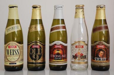 | Keywords: Ceres 001.jpg en Five empty 33cl Ceres beer bottles from left Ceres Weiss Old 9 Strong Ale Export and Ceres Stout it Cinque bottiglie vuote di birra Ceres da 33cl da sinistra Ceres Weiss Old 9 Strong Ale Export e Ceres Stout own Phyrexian 2010-11-10 Beer bottles clear glass Beers of Denmark |