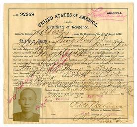 | Keywords: people text writing photo border drawing Repository: California Historical Society Digital object ID: MS 3642.012.jpg Call number: MS 3642 Collection: Certificates of residence for Chinese laborers, 1894-1897 Date: 1894 March 23 Preferred citation: Certificate of residence for Wong Hock Chung, Certificates of residence for Chinese laborers, MS 3642, courtesy, California Historical Society, MS 3642.012.jpg. Subjects: California--Emigration and immigration--History--19th century. Chinese Americans--California--History--19th century. Chinese--California--History--19th century. Identification cards. Online finding aid: www.oac.cdlib.org/findaid/ark:/13030/kt858038qp/ Repository: California Historical Society Digital object ID: MS 3642.012.jpg Call number: MS 3642 Collection: Certificates of residence for Chinese laborers, 1894-1897 Date: 1894 March 23 Preferred citation: Certificate of residence for Wong Hock Chung, Certificates of residence for Chinese laborers, MS 3642, courtesy, California Historical Society, MS 3642.012.jpg. Subjects: California--Emigration and immigration--History--19th century. Chinese Americans--California--History--19th century. Chinese--California--History--19th century. Identification cards. Online finding aid: www.oac.cdlib.org/findaid/ark:/13030/kt858038qp/ |