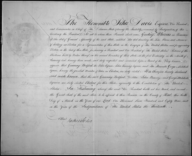 | Keywords: Certification of the electors of the state of Delaware, 03-06-1789 - NARA - 306213.tif Local identifier U S Senate 03/04/1789 - Center for Legislative Archives NWL National Archives Building Room 8E 7th and Pennsylvania Avenue NW Washington DC 20408 1789-03-06 Record group Record Group 46 Records of the U S Senate 1789 - 2011 Record group ARC 375 Credentials compiled 1789 - 1998 Series ARC 306203 Variant control numbers NAIL Control Number NWL-46-ELECTION-1AH1-8 General notes Scope and content File unit File unit ARC yes <gallery> File Certification of the electors of the state of Delaware 03-06-1789 - NARA - 306213 tif TIFF File Certification of the electors of the state of Delaware 03-06-1789 - NARA - 306213 jpg JPEG </gallery> NARA-cooperation PD-USGov derivative works 1789 Delaware elector certification seal embossed jpg James Booth signature jpg Jehu Davis signature jpg 1789 documents Documents in English Documents of the United States Manuscripts Maryland in the 1780s Government of Maryland NARA TIF images with categorized JPGs |