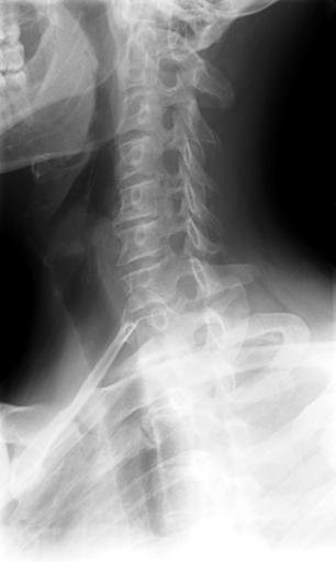 | Keywords: Cervical Xray Lower Lateral View.jpg en X-ray of cervical spine neck lateral side view This series of x-rays were part of pre-surgical evaluation to help identify spinal instability Patient is a 37 year old male with a history of multiple neck traumas with pain and muscle spasms and dental implant in lower jaw Excerpt from radiologist's report FINDINGS Five views of the cervical spine including flexion and extension were performed There is no evidence of fracture bone destruction or malalignment There are degenerative bone and is changes at C5-6 There is no evidence of cervical instability on the flexion and extension views The facet joints are well aligned Bony spurring is narrowing the C5-6 neural foramina bilaterally IMPRESSION Degenerative changes at C5-6 No evidence of instability Ragioagraphie aux raysons X du rachis cervical cou vue latérale côté Cette série de radiographies faisaient partie de l'évaluation pré-chirurgicale pour aider à identifier une instabilité vertébrale Le patient est un homme de 37 ans ayant des antécédents de traumatismes multiples cou avec des spasmes et des douleurs musculaires et implant dentaire à la mâchoire inférieure Extrait du rapport du radiologiste RÉSULTATS Cinq vues de la partie cervicale de la colonne vertébrale ont été faites dont en flexion et en extension Il n'y a pas de signe de fracture de destruction osseuse ni de défaut d'alignement On observe un phénomène de gégénérescence osseuse des changements en C5-6 Il n'existe aucune preuve de l'instabilité du cou sur les radios montrant la flexion et l'extension Les facettes articulaires sont bien alignés Bony spurring is narrowing the C5-6 neural foramina bilaterally IMPRESSION Changements dégénératifs eu C5-6 Aucune preuve d'instabilité own medical image work for hire Stillwaterising 2010-04 File Cervical Xray Extension jpg File Cervical Xray Extension view jpg File Cervical Xray Lateral View jpg Magnification 0 4x converted from lossy DICOM file Cc-zero Oblique X-rays of the neck Human anatomy cervical vertebrae |
