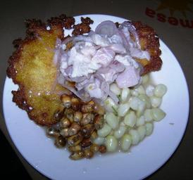 Keywords: Ceviche con tortilla de maiz 2.JPG en Ceviche with a tortilla based in corn Chiclayo Lambayeque Perú es Ceviche con tortilla de maiz Chiclayo Lambayeque Perú own Dtarazona 2008-07 Ceviche of Peru
