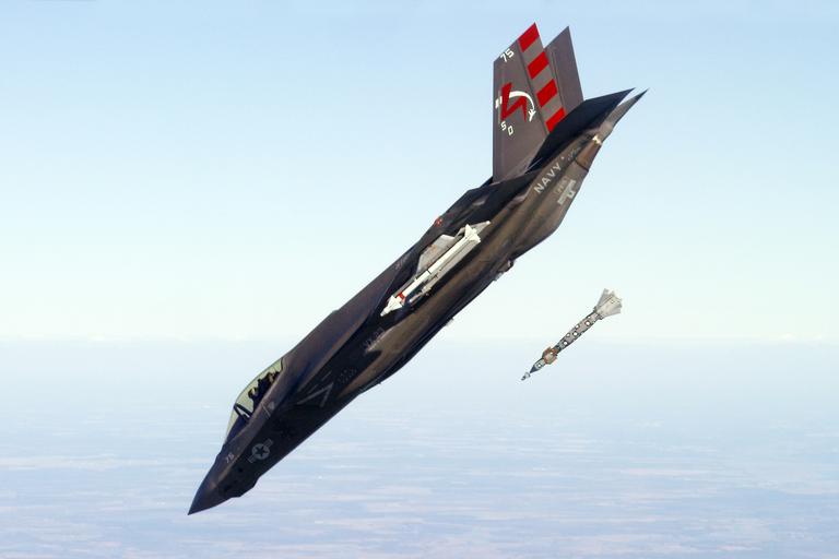 | Keywords: outdoor 16P00054 | Cmdr. Tony "Brick" Wilson takes aircraft CF-05, an F-35C Lightning II carrier variant, into a 45-degree dive during an external GBU-12 weapons separation test February 18, 2016. (U.S. Navy photo courtesy of Michael D. Jackson.) 16P00054 | Cmdr. Tony "Brick" Wilson takes aircraft CF-05, an F-35C Lightning II carrier variant, into a 45-degree dive during an external GBU-12 weapons separation test February 18, 2016. (U.S. Navy photo courtesy of Michael D. Jackson.) |