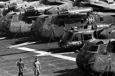| Keywords: CH-53s and UH-1E on USS Hancock (CVA-19) 1975.jpg U S Marine Corps Sikorsky CH-53 Sea Stallions of Heavy Marine Helicopter Squadron HMH-463 and a Bell UH-1E Huey from Marine Light Helicopter Squadron HML-367 aboard the U S Navy aircraft carrier USS Hancock CVA-19 in April-May 1975 Hancock embarked HMH-463 and part of HML-367 to take part in operations Eagle Pull and Frequent Wind Most of her regular air group had been flown to Subic Bay Philippines U S Navy photo http //www navysite de/cruisebooks/cv19-75/040 htm from the http //www navysite de/cruisebooks/cv19-75/index_004 htm USS Hancock CVA-19 1975 cruise book available at http //navysite de/cruisebooks/index html Navysite de 1975 USN PD-USGov-Military-Navy Aboard USS Hancock CV-19 Operation Frequent Wind Marine Heavy Helicopter Squadron 463 Sikorsky CH-53A/D Sea Stallion U S Marine Corps Bell UH-1 Iroquois in the Vietnam War Marine Light Attack Helicopter Squadron 367 |