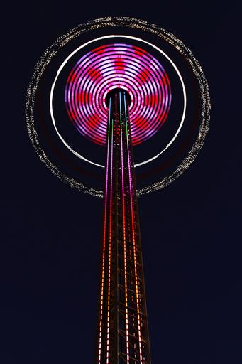 | Keywords: chain aviator tower high 80m fair hustle and bustle year market folk festival carnies fairground pleasure fun leisure fun activity colorful entertainment speed color fast sit chains view no fear of heights upward height turn night lights light attraction |