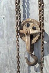 Keywords: chain hoist chain pulley hook wood rust antique hoist