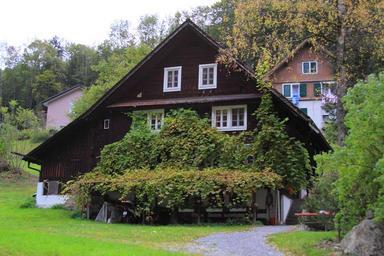 Keywords: chalet mountain hut home switzerland ivy brown green leaf building windows natural