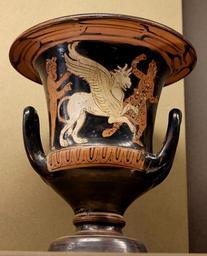 | Keywords: Chalice-crater Louvre CA491.jpg A satyr a griffin and an Arimaspus Attic red-figure calyx-krater from Eretria Satyre griffon et Arismaspe Cratère en calice attique à figures rouges provenant d'Érétrie ca 375 350 BC red-figure ceramic cm 18 3 16 3 Institution Louvre object department Greek Etruscan and Roman antiquities room ID 31 7733 object history Eretria credit line ProvenanceEvent purchase 1892 accession number CA 491 own Marie-Lan Nguyen photo date 2006 artwork license PD-old-100 photo license other versions <gallery> Image Satyr griffin Arimaspus Louvre CA491 jpg </gallery> Calyx kraters Arimaspi in ancient Greek pottery Griffins in ancient Greek pottery Satyrs in ancient Greek pottery Thyrsos in ancient Greek pottery Attic red-figure pottery Greek antiquities in the Louvre - Room 44 |