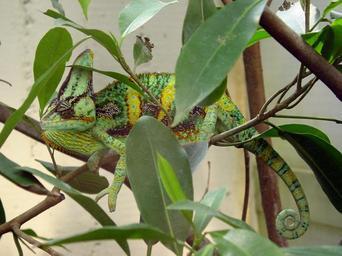 Keywords: chameleon zoo reptile green colorful exotic wildlife lizard camouflage tropical leaves branch