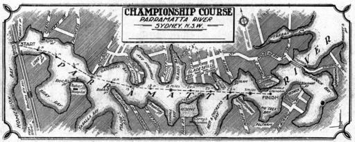 | Keywords: Championship Sculling Course Parramatta River Sydney NSW Australia 1920.jpg en Map showing the route along the Parramatta River which had been the course for championship solo sculling matches since the 1850s 1920-08-28 Souvenir program World Championship Sculling Match Barry vs Felton 28 August 1920 author PD-old Parramatta River Rowing competitions Sydney in the 1920s | ||||