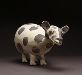 | Keywords: Chancay - Llama Effigy - Walters 20092049 - Three Quarter Front.jpg The llama a native camelid of the Americas touched all aspects of Andean life The llama- the only native American beast of burden-was used primarily to transport goods from the coastal deserts to the highest mountain plains Well adapted to the extremes of the Andean environment including climate terrain and altitude the llama was at the heart of every Andean home The llama and its camelid cousins alpaca guanaco and vicuña provided the all-important hairs that were spun into fibers to weave warm garments of considerable strength and durability Such clothing was crucial for survival during cold Andean nights and in the altiplano highlands Llamas also provided body heat for shepherds and other laborers who could not return to a warm home every night Llama blood was an important ritual offering and its meat was occasionally consumed for protein although the high value of the living animal made these latter uses infrequent and of special significance During the Late Intermediate Period the Chancay Valley and adjacent Chillón Drainage developed an energetic corporate style of architecture and art Large amounts of ceramics were produced and distributed among the ruling elite as well as those of lesser status Among these are the distinctive mold-made and hand-modeled sculptures of humans both men and women and animals This engaging sculpture of a young llama captures the animal's natural inquisitiveness It cocks its head slightly to the side as if watching intently some unseen activity The artist divided the llama's face into two halves painting one side white and the other black following the Andean principle of duality and balance The artist also designated the animal's sex as male and embellished the body with black spots one of the natural coloration schemes of the animal Typical of the distinctive Chancay pottery style is the somewhat haphazard modeling and painting which enhance the piece's charm AD 1000-1470 Late Intermediate earthenware slip paint cm 21 11 40 39 16 accession number 2009 20 49 80204 Economos Works of Art date and mode of acquisition unknown John G Bourne 1990s by purchase Walters Art Museum Gift of John Bourne 2009 place of origin Central Coast Walters Art Museum license Pre-Columbian art in the Walters Art Museum Chancay pottery Llamas in art Animals in Pre-Columbian art |