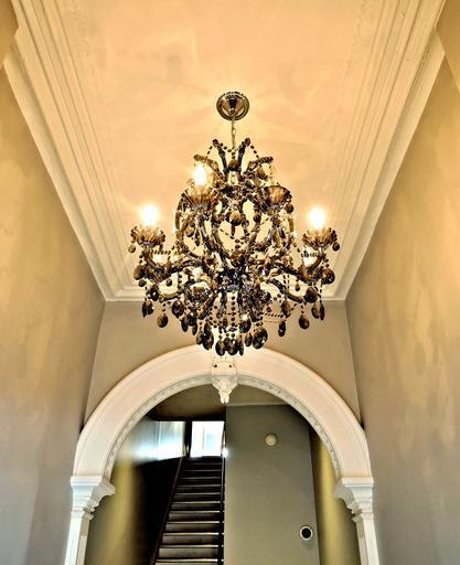 Keywords: chandelier hallway building design archway stairs