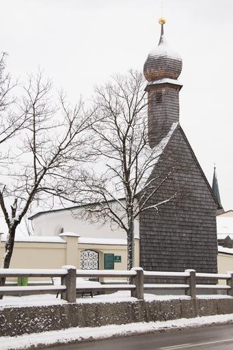 Keywords: chapel winter snow shingle wood shingles onion dome steeple spire church christianity architecture bavaria