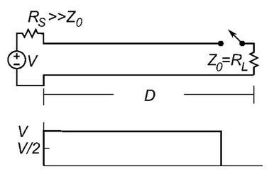 | Keywords: Charge line animation.gif charge line generator a transmission line circuit for generating ultrashort nanosecond pulses of electricity It consists of a length of transmission line D connected at one end to a DC voltage source V left through a resistance R<sub>s</sub> which is very large compared to Z <sub>0</sub> the characteristic impedance of the transmission line and at the other end through a switch to a resistive load R<sub>L</sub> which is matched to the characteristic impedance Z<sub>0</sub> When the power supply is connected it will charge up the capacitance of the transmission line to voltage V Then when the switch is closed the charged transmission line will be discharged through the load in a precise pulse of duration T 2D/c where c is the propagation velocity in the transmission line 2013-07-01 23 48 42 own Chetvorno cc-zero Uploaded with UploadWizard Blumlein generators Transmission lines Pulse generators Animated GIF Animations of electronics |